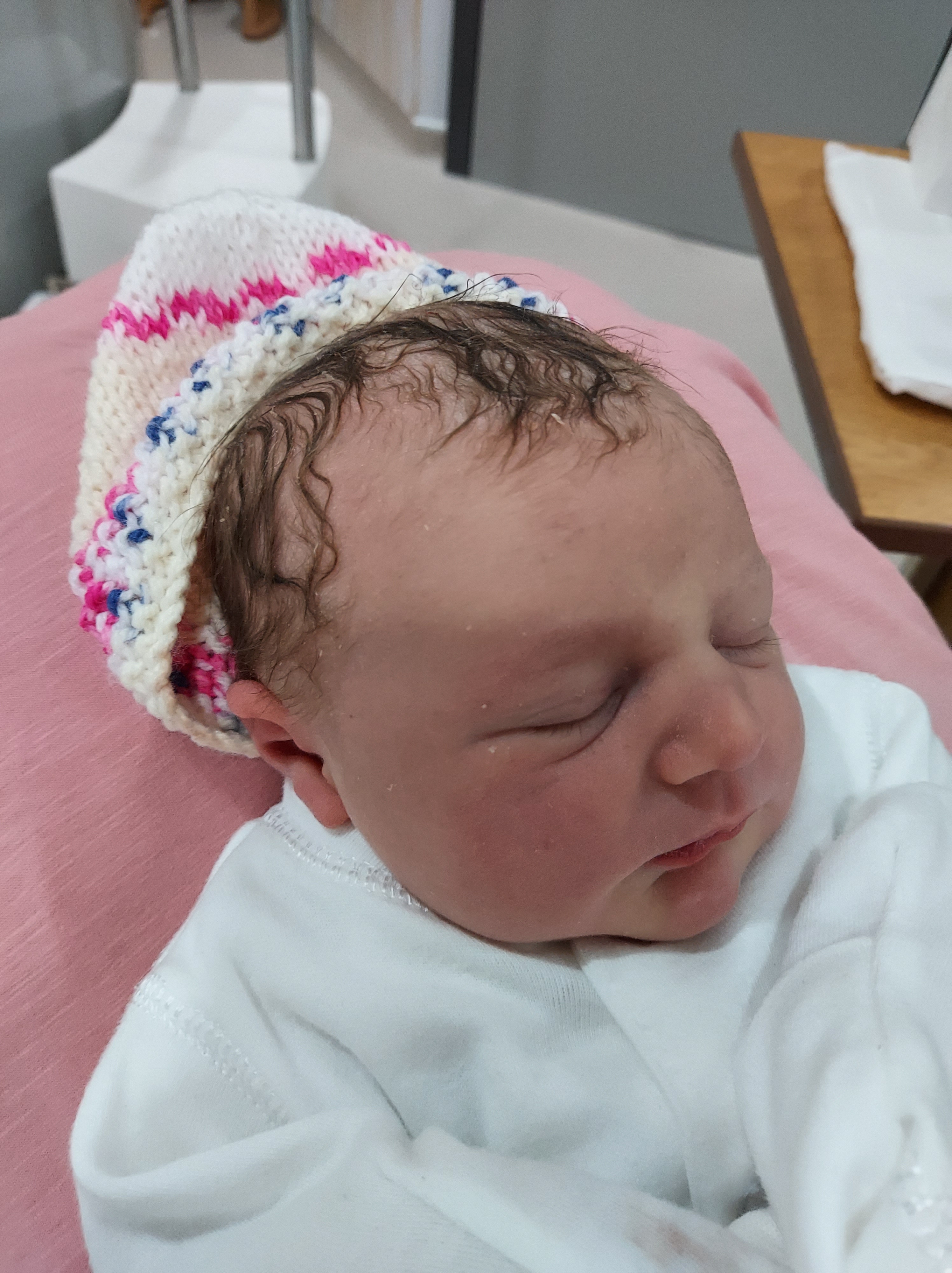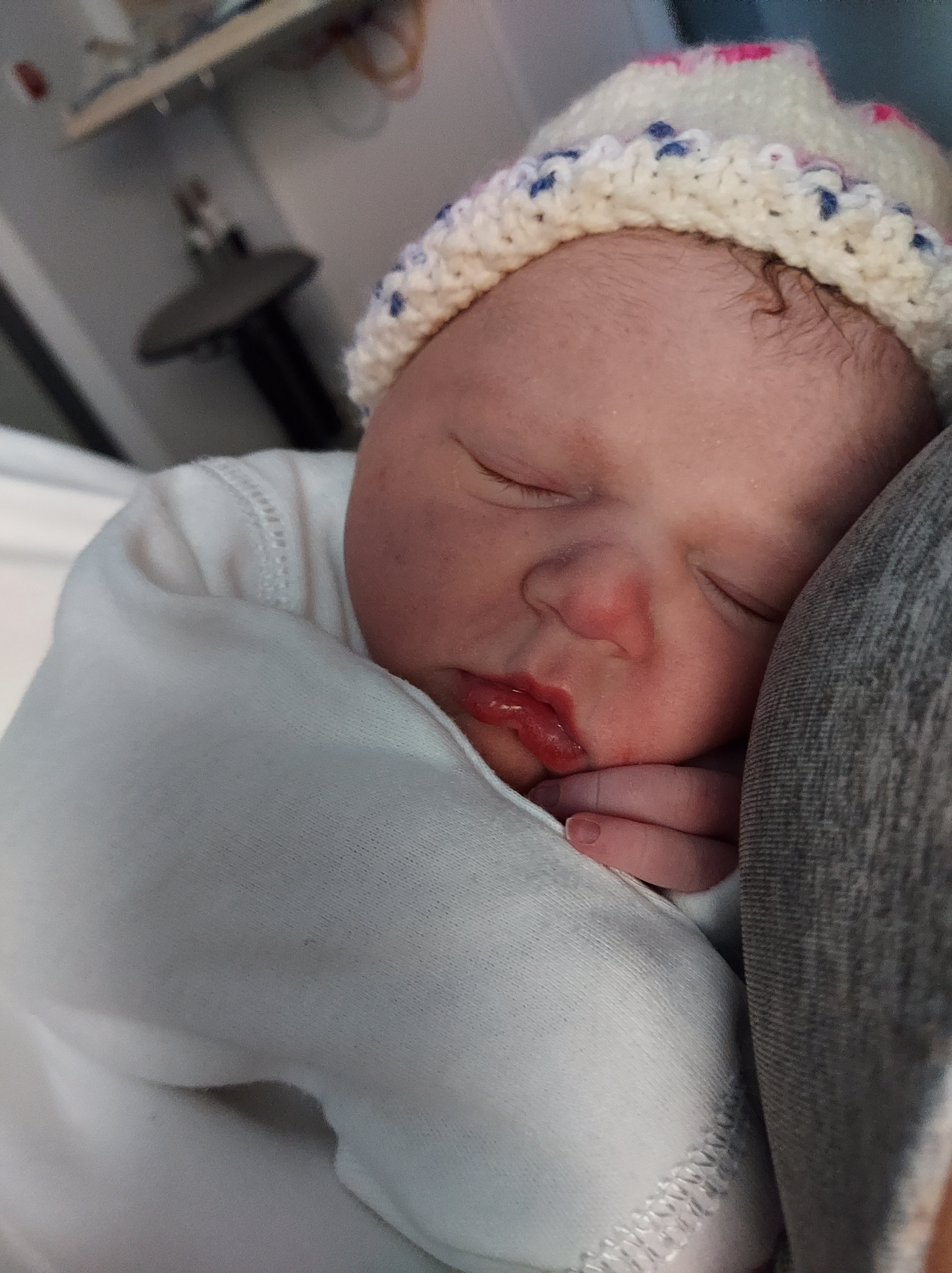 Andrew set up his phone and took this image to send to my Mum. Polly said to her oh wheres the baby…. guess 3 year olds think it’s just like going to a shop and buying a toy hehe. The midwife’s were really good and kept checking in on us and topping us up with cups of tea and then put me onto the monitor to keep and eye on how bubs was doing. I think they removed my rods about 2.30pm which was amazing to get them out and go to the toilet normally and wipe without worrying about them falling out etc, just felt so much better with them removed. They then broke my waters after they removed them. Now I have to say that hurt! With Polly my waters went naturally so I never experienced that before and oh my that was rather painful, the first attempt hurt so much as they were still far back, so the second attempt I had some good old gas and air to help through the pain. I was only 1cm at this point.I then got changed into my nighty and they then wanted to see if I would go into labour naturally. I was told if nothing had happened after 2-4hours I’d then go onto the hormone drip to kick things into gear. I was happy to have that because I’d experienced it during Polly’s labour. They got me a birthing ball to bounce on and my waters kept leaking too so I clearly had alot of water like I did with Polly. I was also aloud some early dinner as I was told I couldn’t eat once on the hormone drip. Whilst on the ball and eating I kept feeling little niggles or period type pains which would come and go so thought that was a good sign. I also started feeling sick which I knew was a good sign for me as I was sick in labour with Polly. At about 6pm I was then monitored again before going on the drip. I just made sure I drunk plenty to keep hydrated and chilled on the bed while I was monitored. They were really busy so by the time they finally went to put me on the hormone drip, neither midwives could get a good vein so I then had to wait for an anaesthetist to come and hook me up. This finally happened about 8pm. At this point the midwife who had been looking after us was then coming off her shift so by 8.30pm I had a new midwife.She was really nice and chatted lots to us and would then leave us for a little bit but from what I remember was in and out quite alot. Now at this point I just want to add that I know every birth is different but going back to Polly’s birth and how quick it was I was convinced we would have a baby that night. With Polly my waters had gone naturally and by the time I was induced on the drip at 11pm I was 4cm and she was born at 2.38am so less than 4 hours!But because I was only 1cm I knew it could take a while. There is something about that hormone drip though once it’s on and working away inside your body it seems all systems go. Again I’d heard 2nd babies can come quicker and the labour be more intense, well the second part of that was very true. I went from no contractions to 4 every 10mins. I started off standing then after a while lent over the bed then awhile later had gas and air. Again in my head I didn’t want any but when your body is in so much pain you just need something to take the edge off as I felt it was worse than with Polly.I then made sure when I was on the bed I stayed on my knees and if needed to lean over anything I lent of the headboard area etc. This is how I thought I’d give birth. The pain just go more and more intense and at one point the midwife in charge came in and I heard her say to our midwife to turn the drip because we don’t want to make mum tired and I remember thinking thank God because I was literally having about a minutes break between contractions which lasted only about a minute but oh my the pain was horrific. I remember Andrew asking me what I thought the time was. I said about 11.45pm to which he replied 1.15am, I then thought argh well were be having a 9th baby not an 8th. I asked to be examined hoping I was 10cm. I wasnt aloud to be examined as it was too soon apparently but I remember getting that pushing feeling thinking the head must be there because baby felt so so low at this point and just how intense the pain was etc. I then said I need an epidural because I just felt to tired and worn out. I wasn’t aloud one because I was too close to giving birth but I still didn’t know at the time I was almost 10cm. Which each contraction and everytime I tried pushing her heart rate dropped. I remember the senior midwife then said to me come on Mum we need to get this baby out because their getting a little bit tired, I know she meant distressed. So with that my legs were put in stirrups which again was something I didn’t want but by this point you just want baby out. I still had the belts over my tummy to monitor baby and then got told to start pushing. It honestly felt an age to push her head out. Once it finally came out the midwife put a little clip on her head to monitor her and took the belts off me at least. Once her head was out I remember thinking not to push until that next contraction (because I didn’t do this with Polly who flew out and I tore badly). Waiting for that next contraction was like waiting for a bus, it felt an age and I remember the midwife having to rub my tummy to get it going. Once it finally came I pushed and out she came. She felt so wet and warm on me and they then said well what have we got and in my notes I’d asked for Andrew to tell me and when he said it’s a girl my heart just burst. I did it, she was here safe and well our 2nd beautiful baby girl.