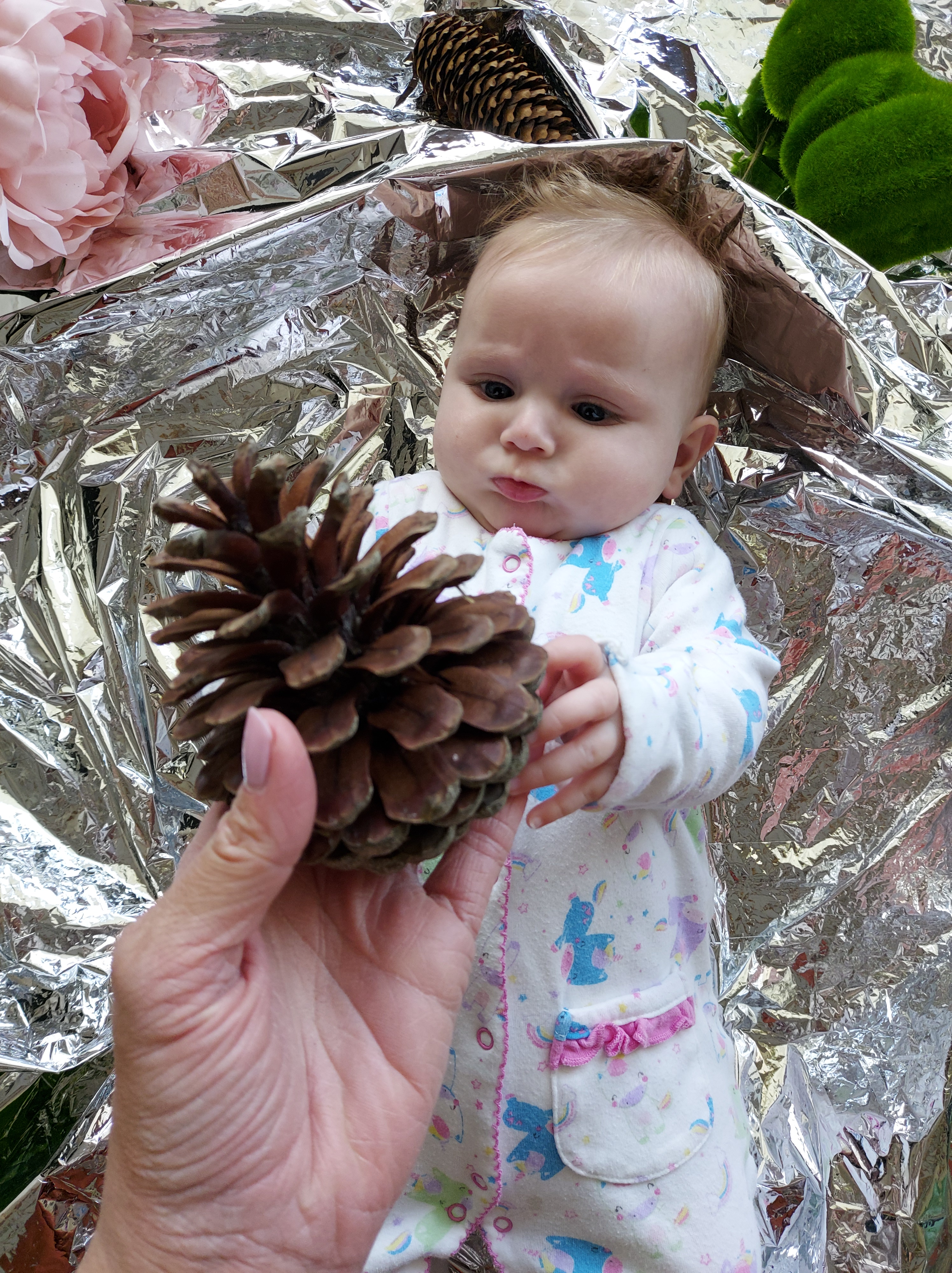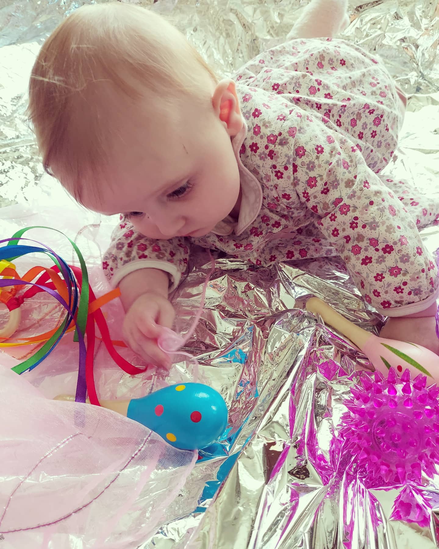 Well we’ve had some more sensory fun which Lola loves. I try to do things like this when Polly is at school so that I get that one to one time with her which is so lovely. These were all items I had around the house, she loved the textures of the pinecones and always loves the noise that foil blanket makes. You can’t see very well on the pictures but I blew her some bubbles and you could literally see her little mind trying to work out what was floating infront of her.