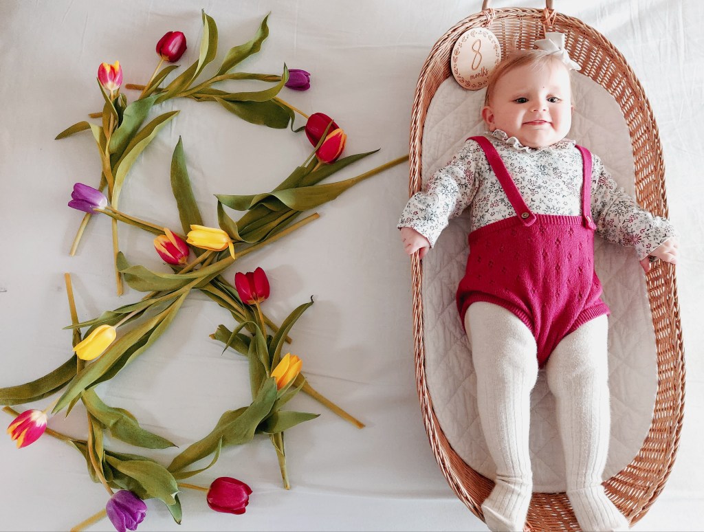 Seemed fitting to use tulips for her monthly milestone picture as it’s March and they remind me of spring so much! Those and daffodils too! We found a lovely park in Suffolk that had such a beautiful display. I will take Polly back with us next time when she is on half term for some cute pics of both the girls but for now I’ll leave this here.