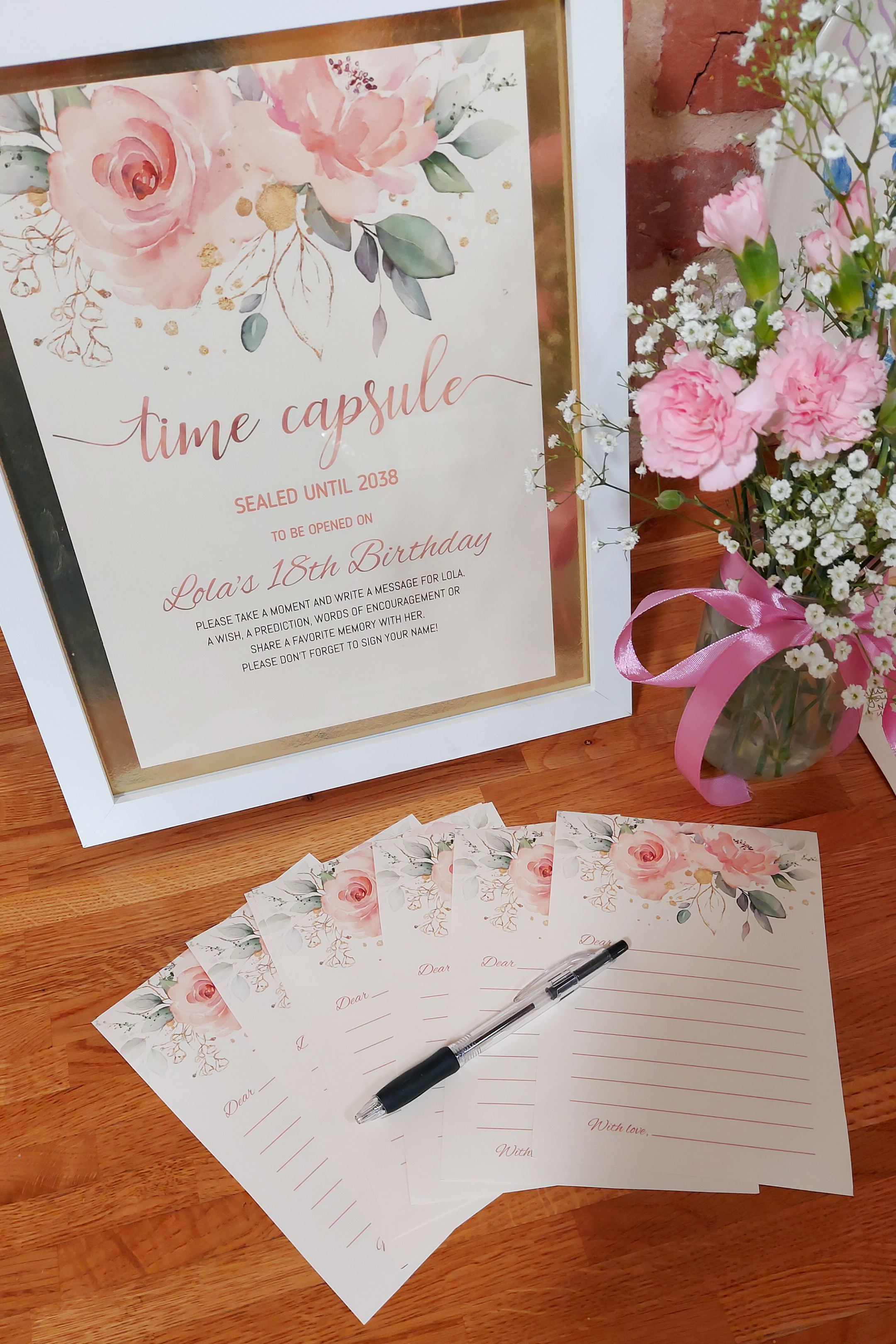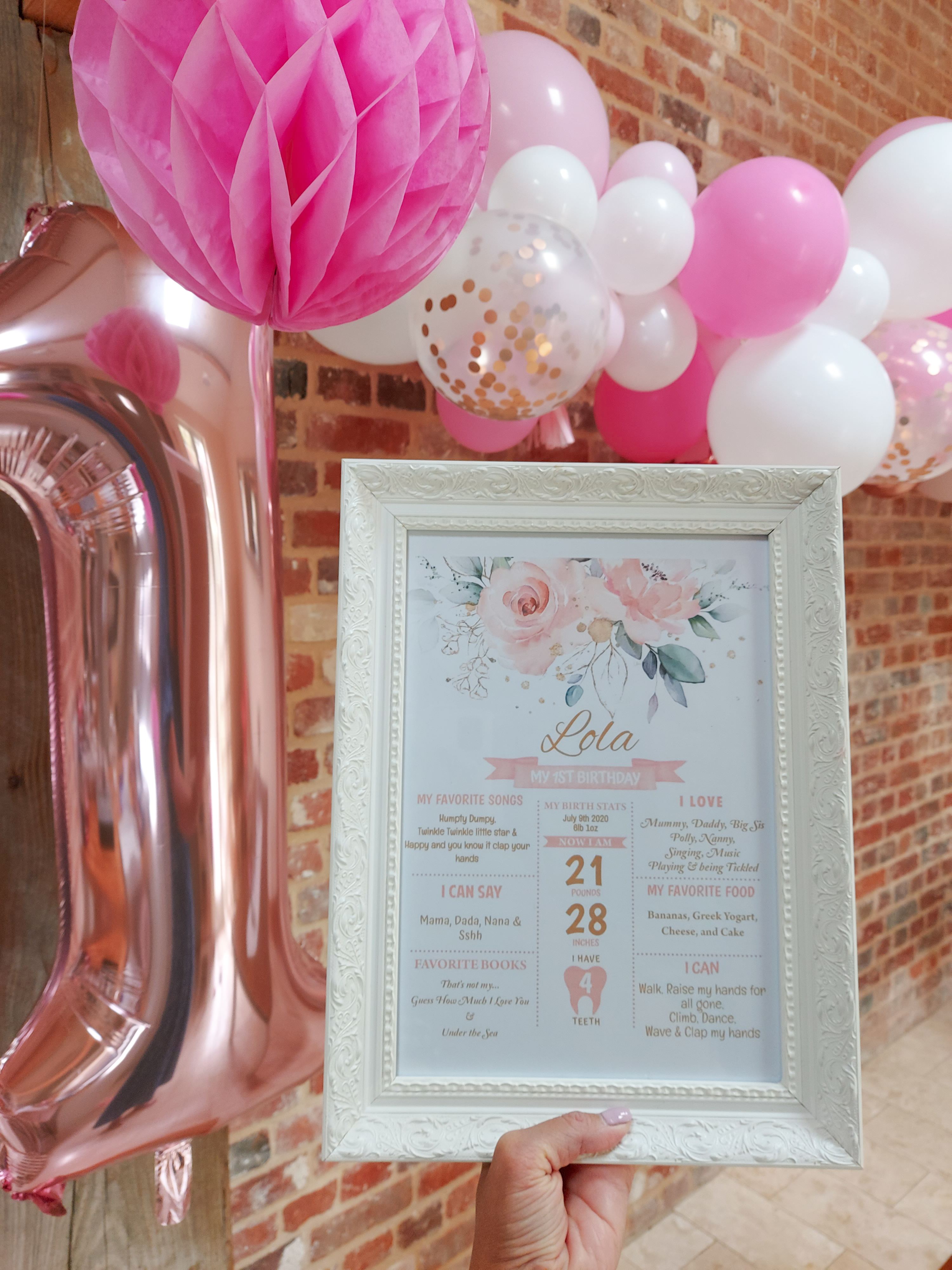 I also did a time capsule, something I did for Polly’s first birthday so I got people to write messages for her and I will give it to her on her 18th birthday. Might sound silly to some but even with the girls only having an almost 4 year age gap, Polly will have a message in there from my Dad but Lola won’t so I know how precise these little messages can and will be. I kept with the same theme, floral of course which a lady made them for me online. She also did me a big sign which Andrew laminated for us to hang on the door, originally for the door at the hall so people knew they were at the right place etc.