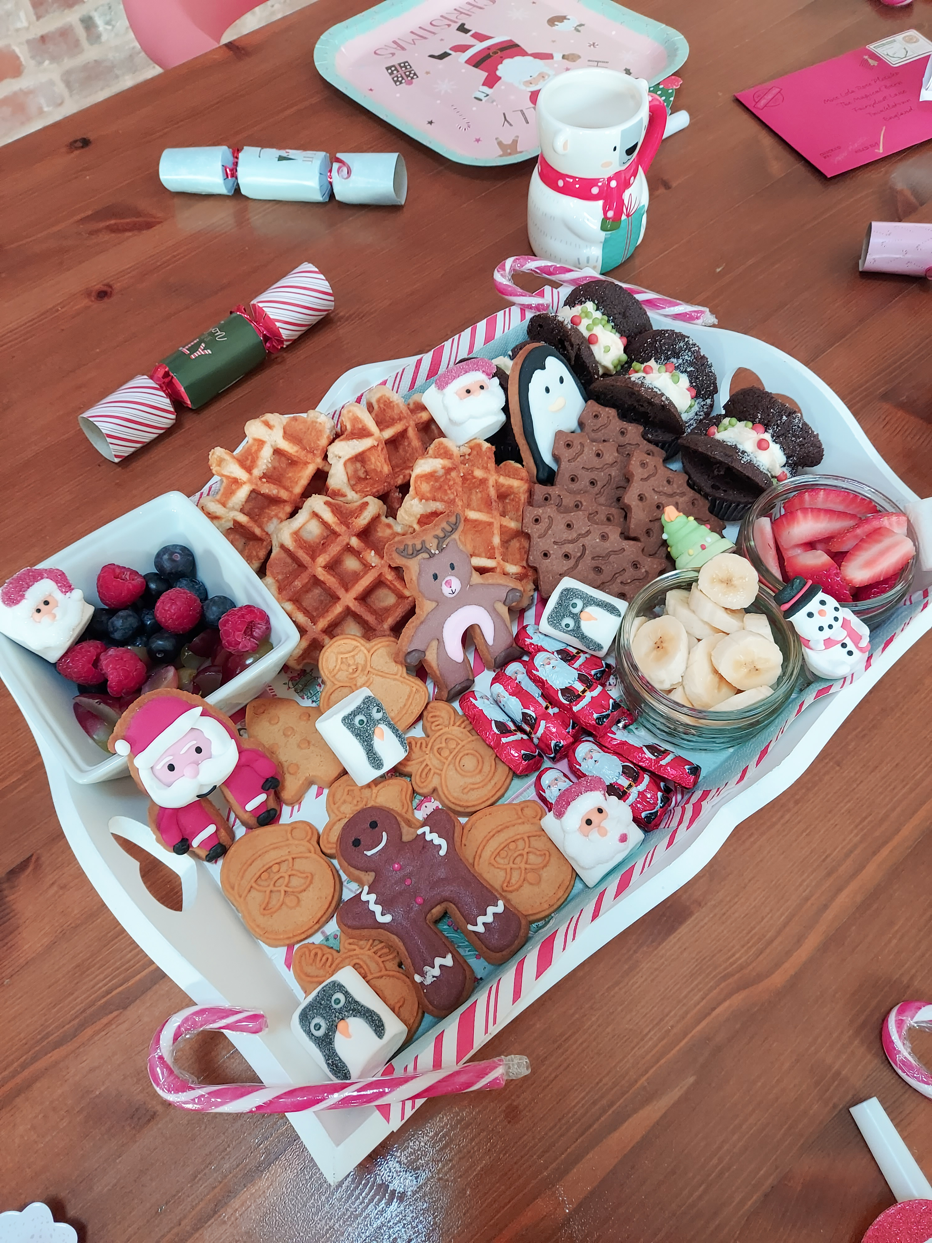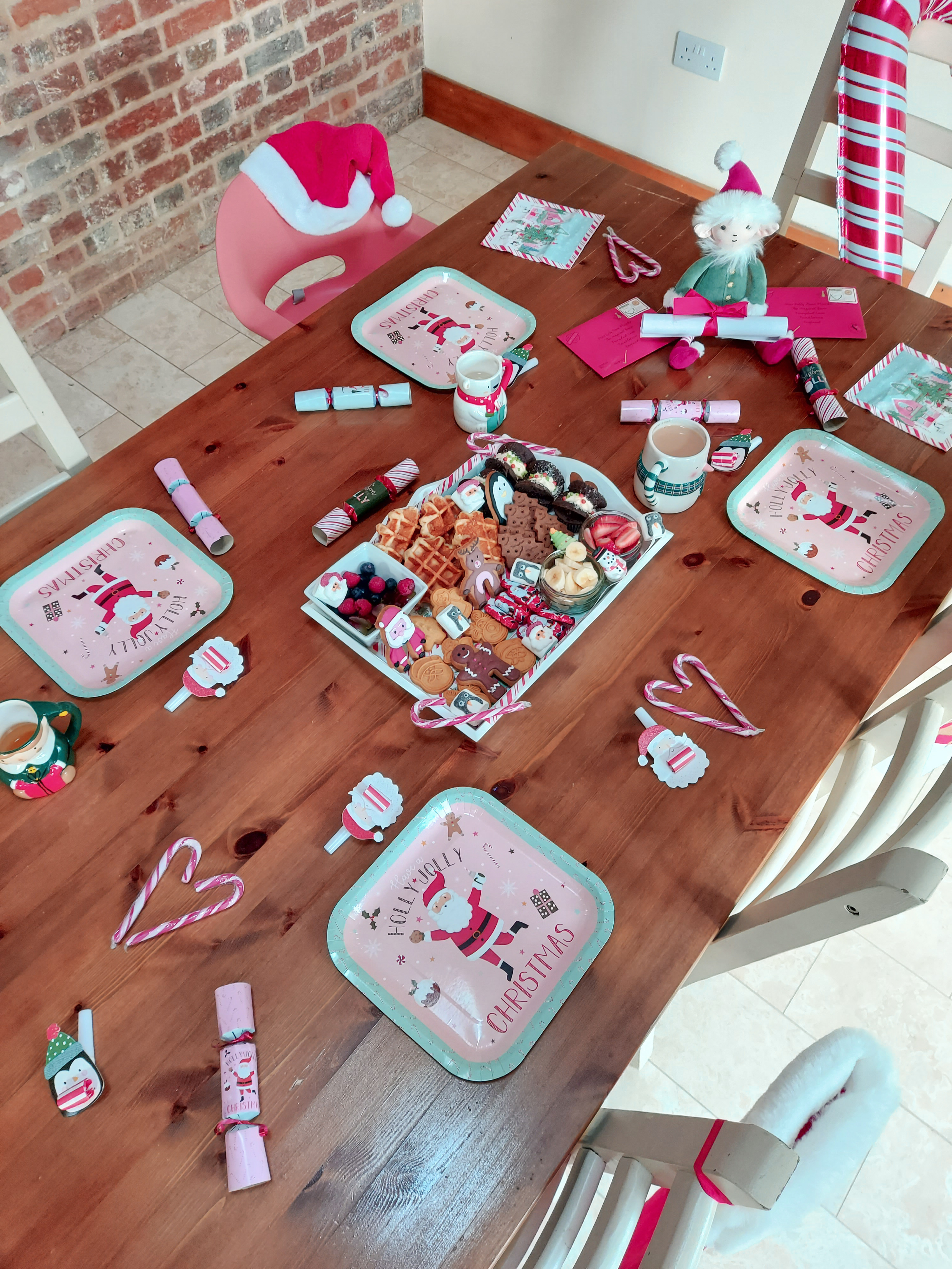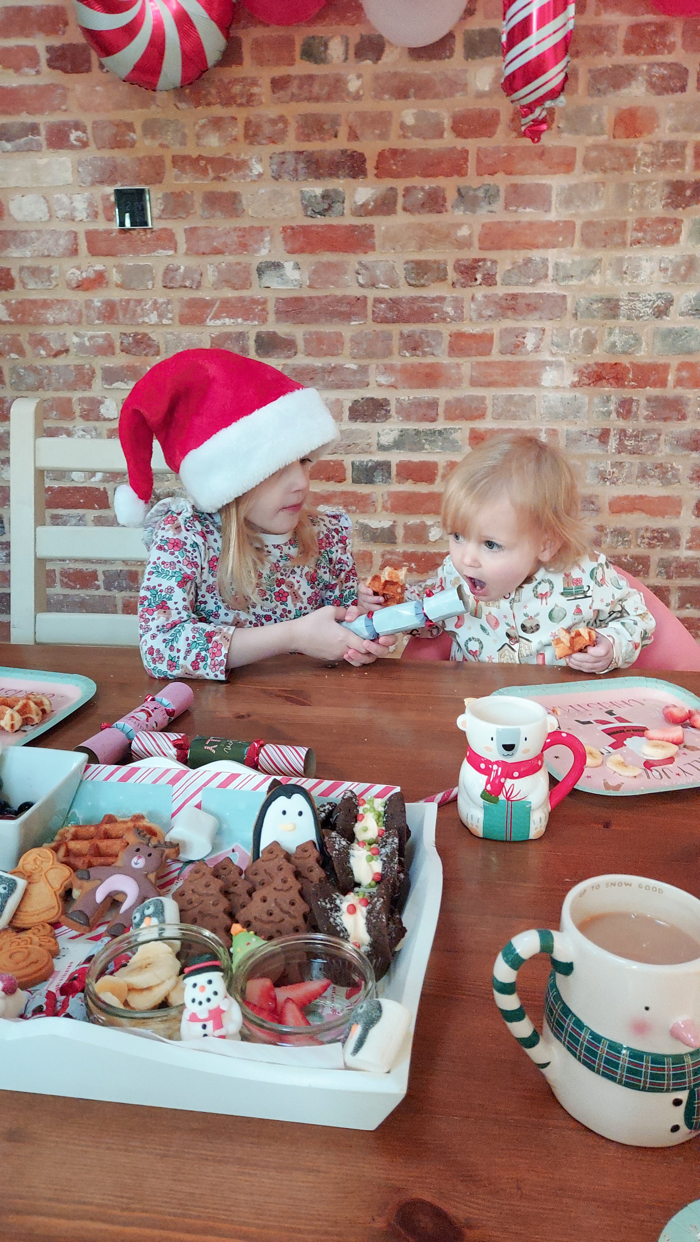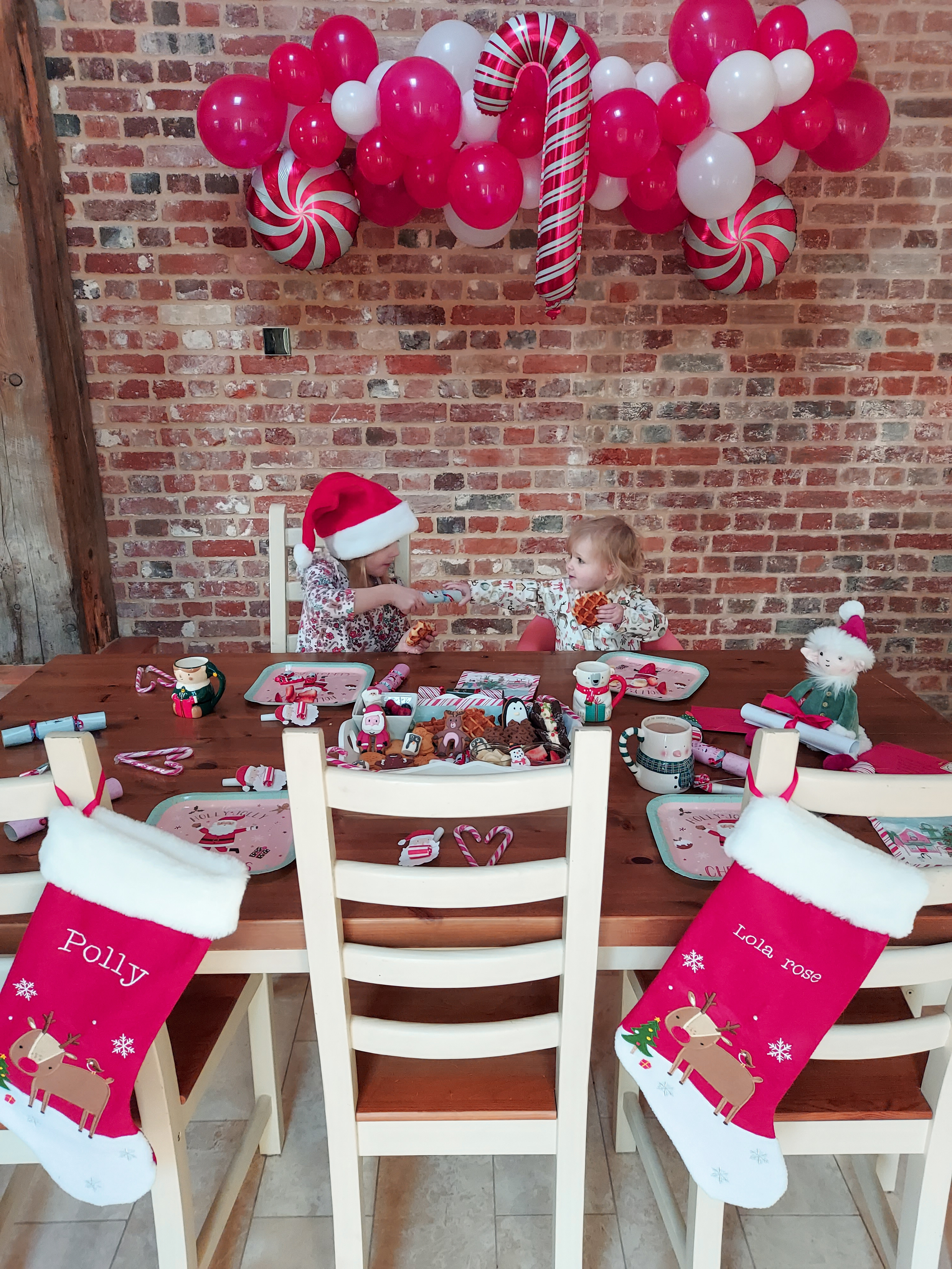As you can imagine this was lots of fun! Lola especially loved the buffet style breakfast thinking she could help herself to absolutely anything hehe. The stockings were lovely presents last Christmas from our kind neighbours. I brought a Jellycat Elf in the hope to do some “Elf on the Shelf” style things with him each day. He also brought the girl’s their letter from Father Christmas. I got Polly to post her letter the day before so she didn’t twig anything. But everything else was just little bits from B&M and Home Bargains to add that decorative Christmas feel and the balloons lasted ages! As for food Polly’s favourite breakfast treat is waffles or pancakes so I guess those and the fruit was the only healthy part to the tray.