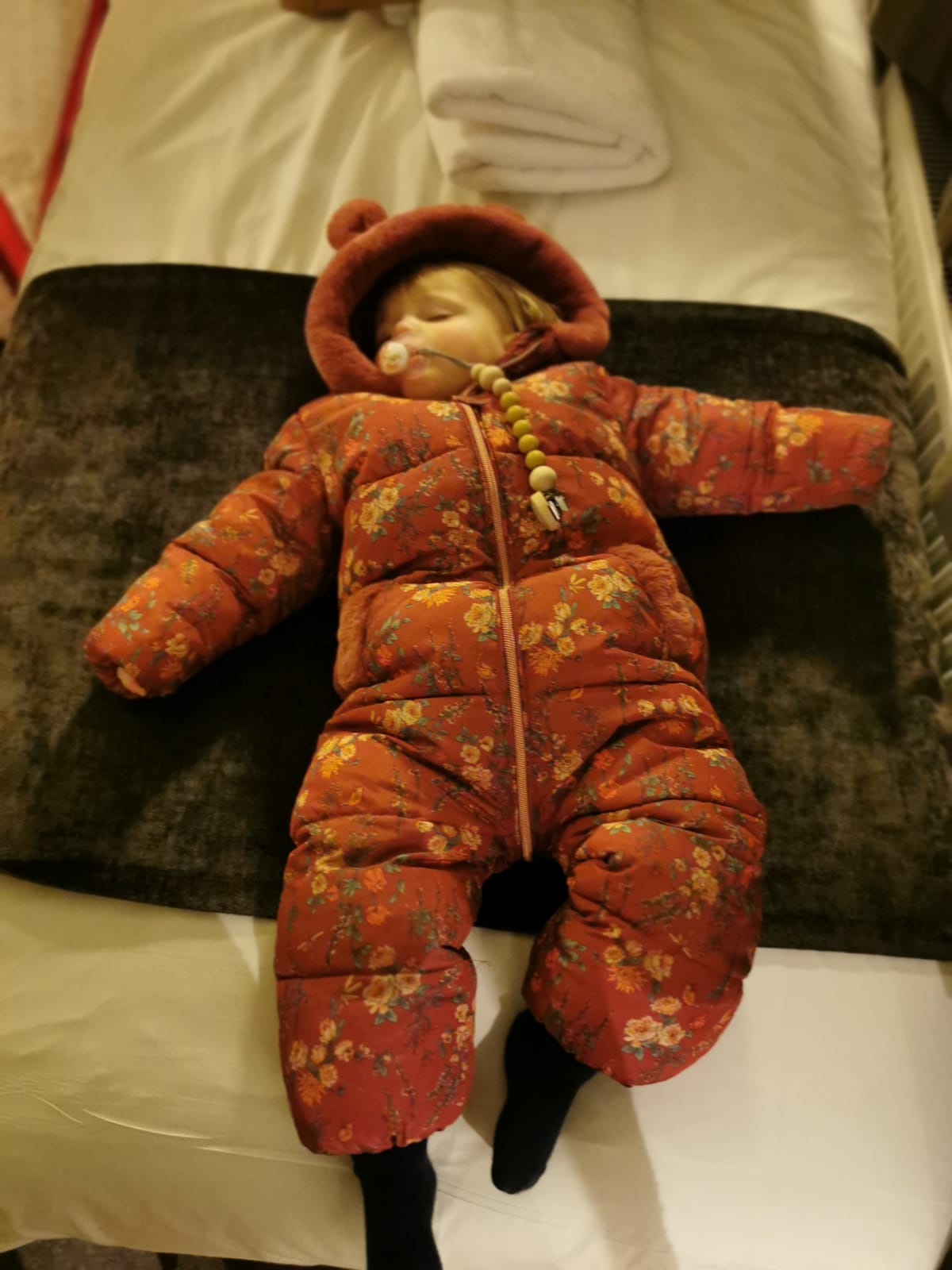 We picked Polly up from school and pretty much headed straight there. I took my car which was full to the brim and Hubby took his van with our bikes in it. The last holiday here I didn’t have a bike, but mine has a seat on the back for Lola and Polly loves biking and can bike far so made sense to take our own. We could head straight to the villa when we arrived and unpacked all our bits and Bob’s. I had brought a pizza and salad to have at the villa that evening as a quick tea before then heading swimming. At Center Parcs currently you have to pre book swimming apart from 6pm onwards when you can just turn up and swim so that’s what we did. The girls had a blast and Lola especially loved it as she isn’t confident in the water and almost doesn’t like the idea of swimming. If she was my first child I’d say it was an age thing but Polly has loved it ever since she started swimming lessons at 12 weeks old. So it was lovely to see her find her feet and enjoy it. We then saw all the pretty lights around the village square before biking back to the villa. It was clearly all abit too much for Lola as she had fallen asleep on the way back to the villa.