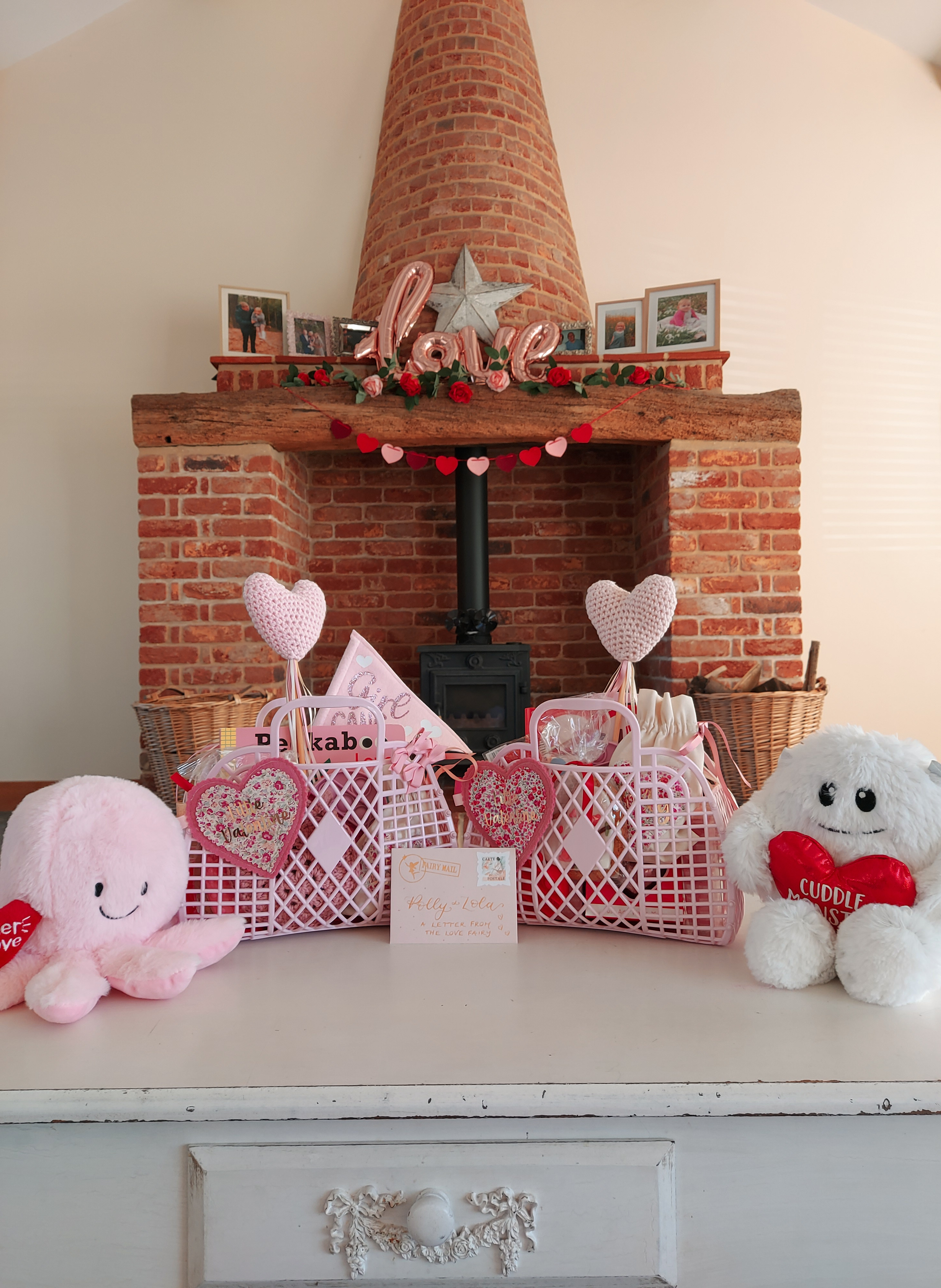 I ordered the jelly basket bags online and as they arrived flat was able to store them for a while. They then had a cuddly toy each (only £2.99 from card shop), the gingerbread cookies were from our local garden centre, the books Amazon although they had already been reading them. The large heart poppers were also Amazon. The personalised sweet bags, crochet wands, girl gang flag, heart badges were from Rosebuds & Ribbons online and then all the other sweets, mini keyring poppers, bath bombs, nail polish set and hairclips were all Home Bargains. I tend to see little bits grab them and put them away, that way it doesn’t seem like your spending a fortune all in one go either. I also got them a joint “Love Letter” from the love fairy from Sugarplum Fable who I found via Instagram. It’s personalised and mega cute something I will use each year while they still believe etc but I know when Polly doesn’t she will keep it going for Lola’s sake. Also half of this I will use again next year with just new chocs etc. I saw one lady online just fill her children’s baskets with all of their own toys which they haven’t played with in ages and I thought that was a brilliant idea, as little ones easy forget what they have an don’t have.