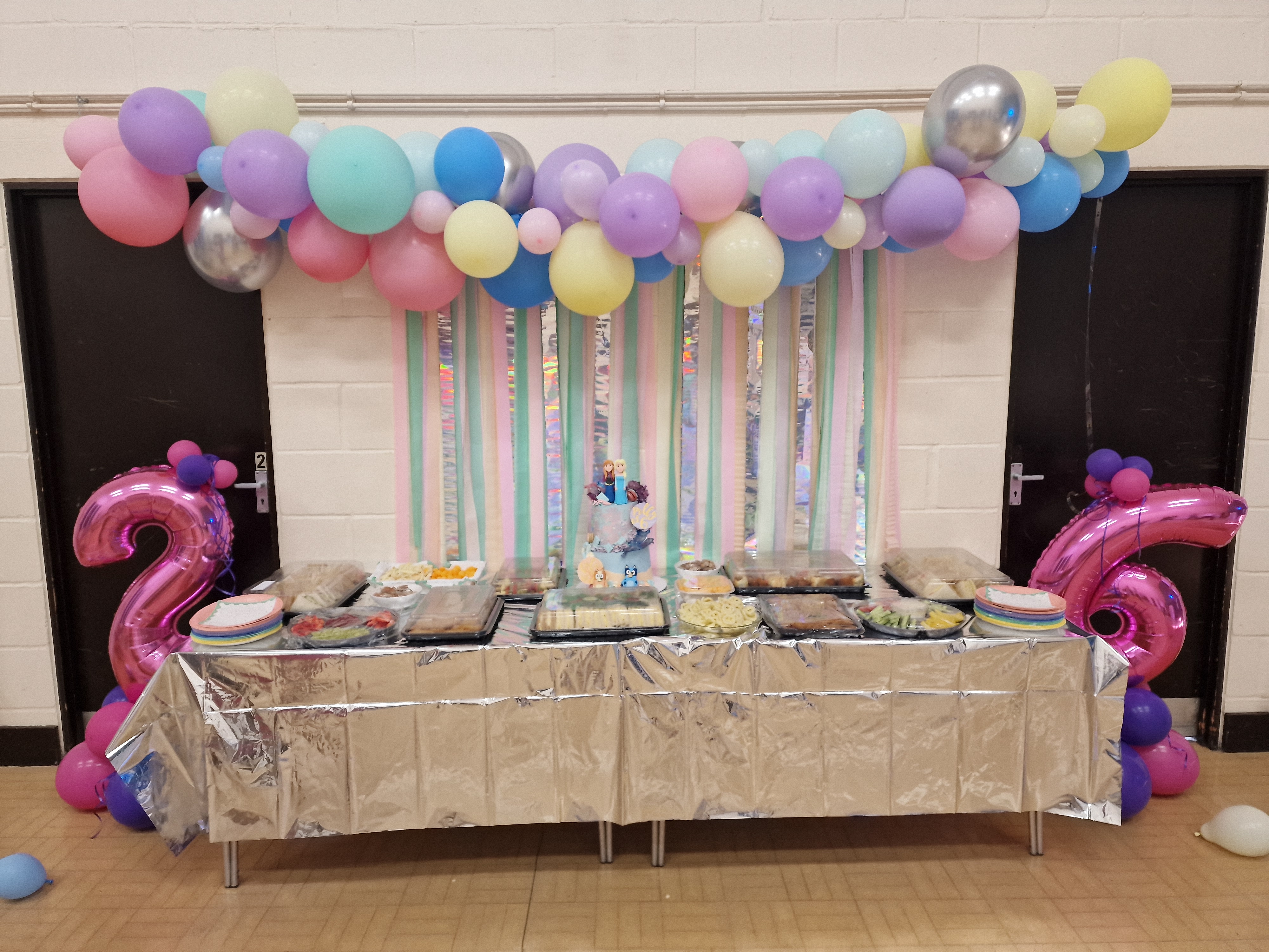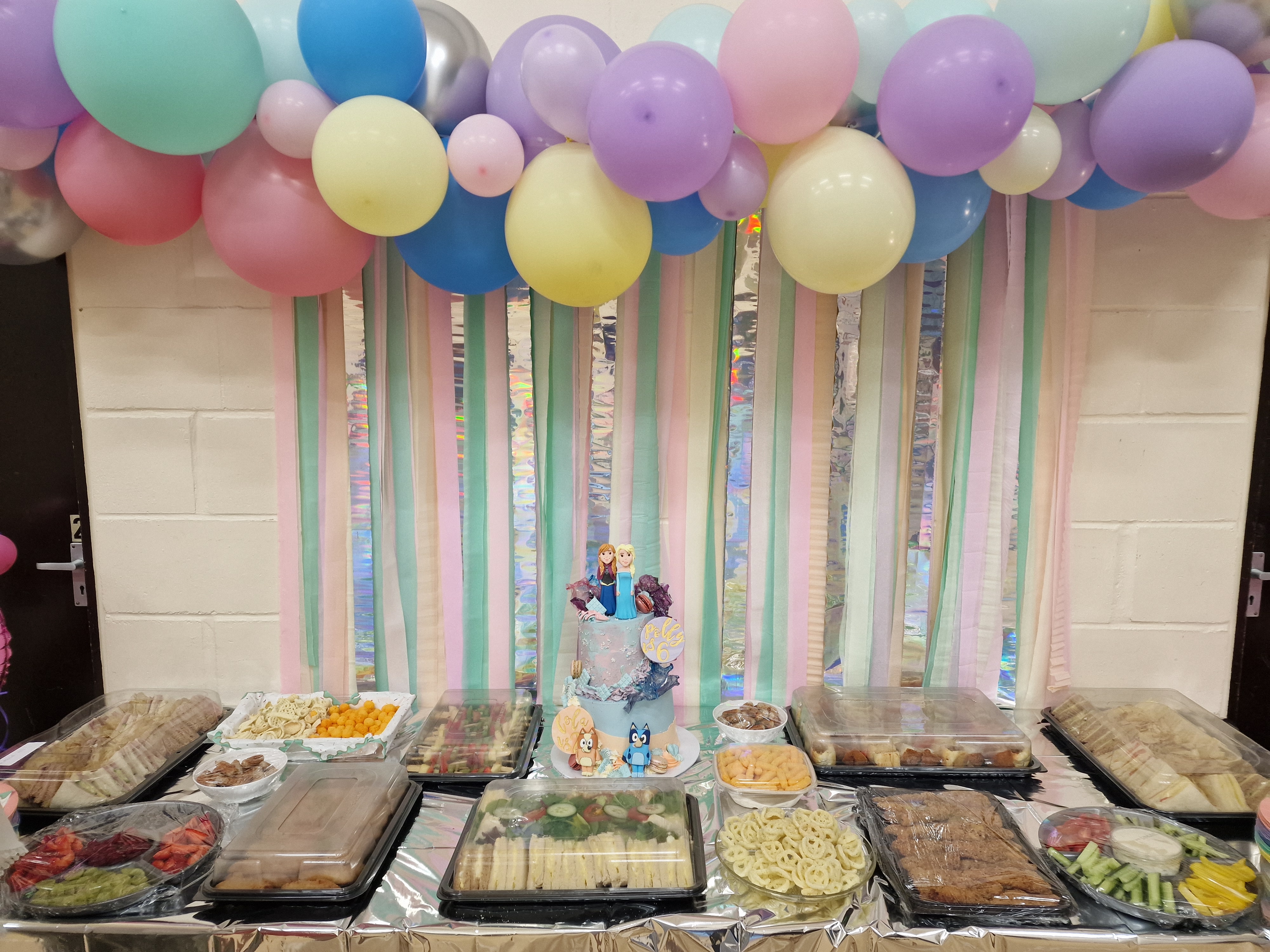 One of my best friends managed to take these pictures at the end of the party as we were tiding away as we didn’t have chance before because Hubby stayed out of the way with the girl’s while another two of my best friends helped me set up and tidy away. We could get in the hall an hour before at least but those 60mins soon whizz by. By the time you’ve put out tables and chairs, put up streamers, the balloons were done at home at least but then I chopped up all the fruit and veg there as easier to take there etc. The DJ arrived there aswell as the main party food being delivered because let’s face it who really wants to be making lots of sandwiches!